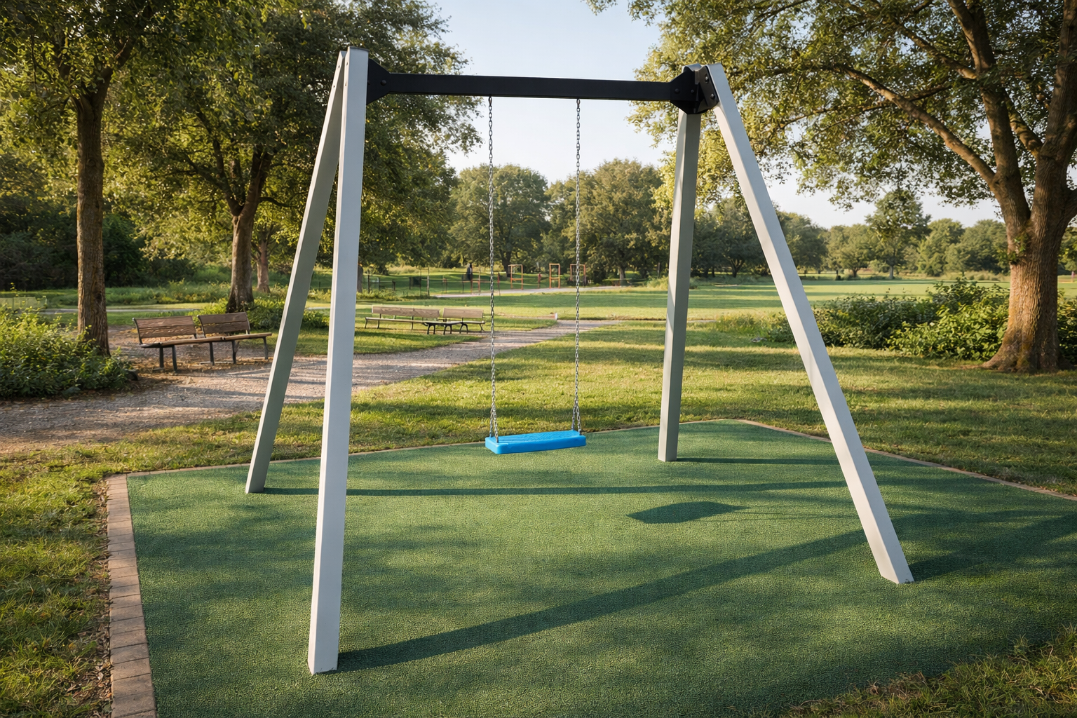 Konstrukci houpačky tvoří ocelové profily s důrazem na pevnost, stabilitu a dlouhou životnost. Šikmé podpěrné sloupy zajišťují stabilitu celé sestavy a vrchní nosník slouží k bezpečnému uchycení závěsných prvků. Povrchová úprava chrání konstrukci proti povětrnostním vlivům i běžnému opotřebení. Houpačku lze osadit různými typy sedáků dle požadavku.